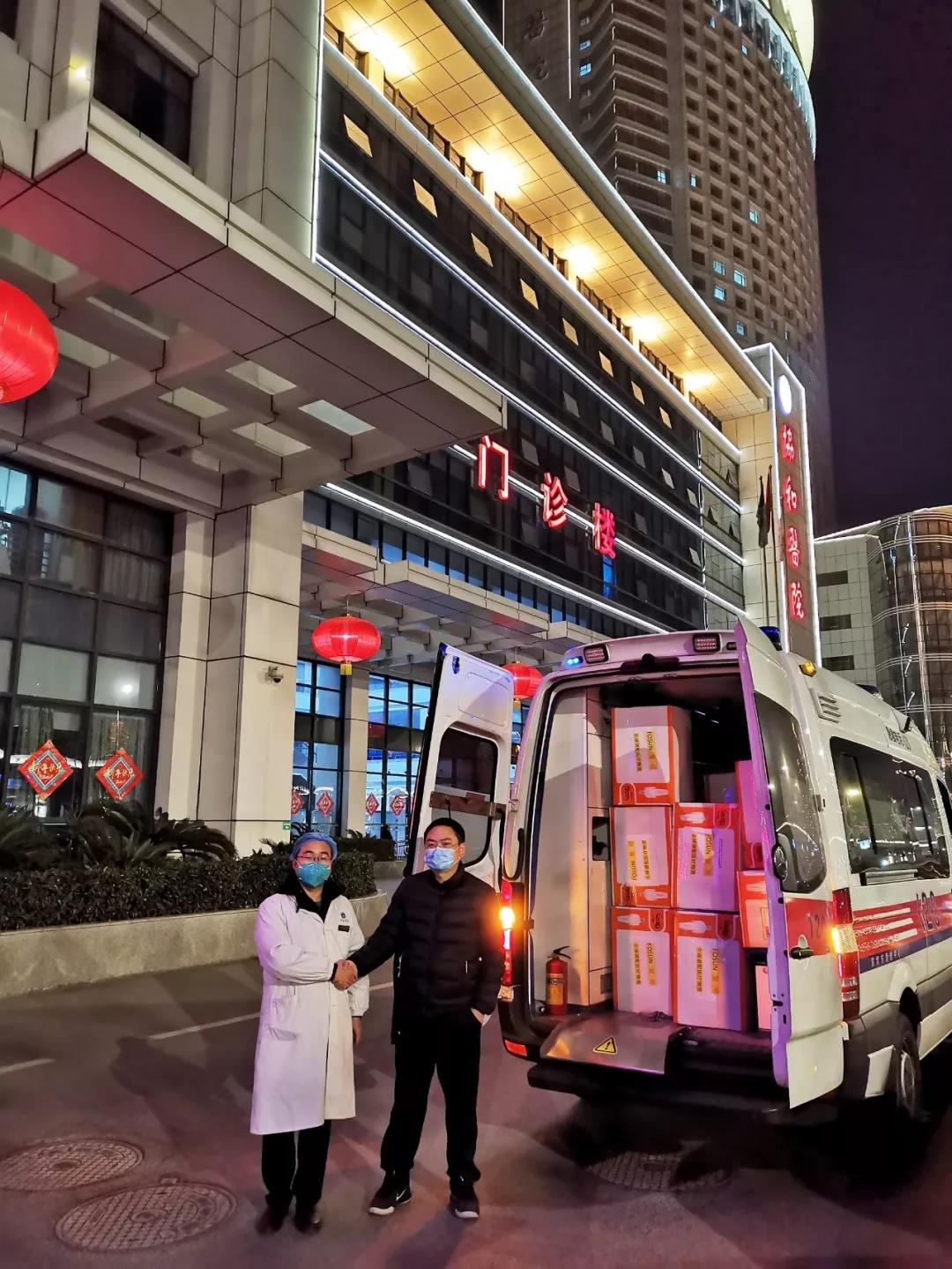 复星医药副总裁、复星医疗执行总裁包勤贵代表送达,武汉协和医院党委副书记孙晖受华中科技大学同济医学院副院长、同济系防疫物资总调度胡华成委托,接收了上述捐赠物资。